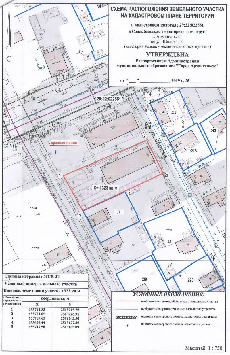 2. Адрес месторасположения земельного участка: г. Архангельск, ул. Шилова, д. 31. Данный земельный участок расположен в кадастровом квартале 29:22:022551. Планируемая к утверждению схема расположения земельного участка: