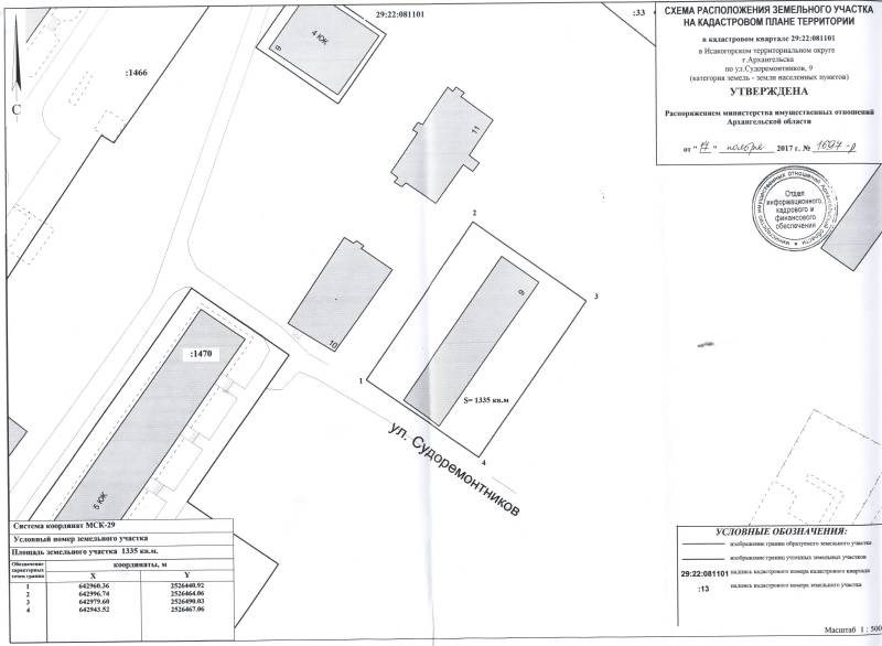 2. Адрес месторасположения земельного участка: г. Архангельск, ул. Судоремонтников, д. 9. Данный земельный участок расположен в кадастровом квартале 29:22:081101. Утвержденная схема расположения земельного участка: