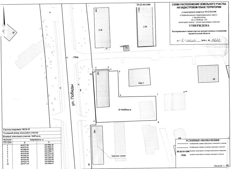 2. Адрес месторасположения земельного участка: г. Архангельск, ул. Победы, д. 142. Данный земельный участок расположен в кадастровом квартале 29:22:011306. Утвержденная схема расположения земельного участка: