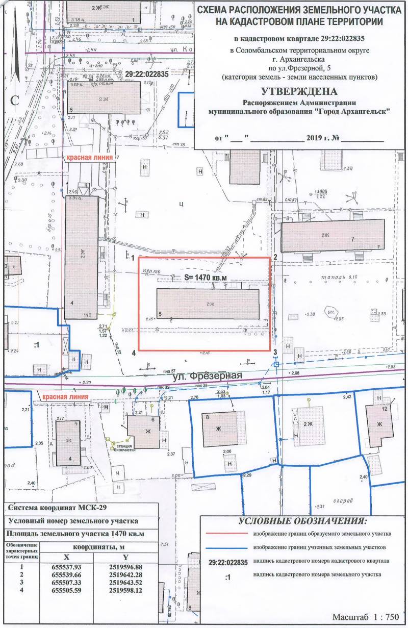 2. Адрес месторасположения земельного участка: г. Архангельск, ул. Фрезерная, д. 5. Данный земельный участок расположен в кадастровом квартале 29:22:022835. Планируемая к утверждению схема расположения земельного участка: