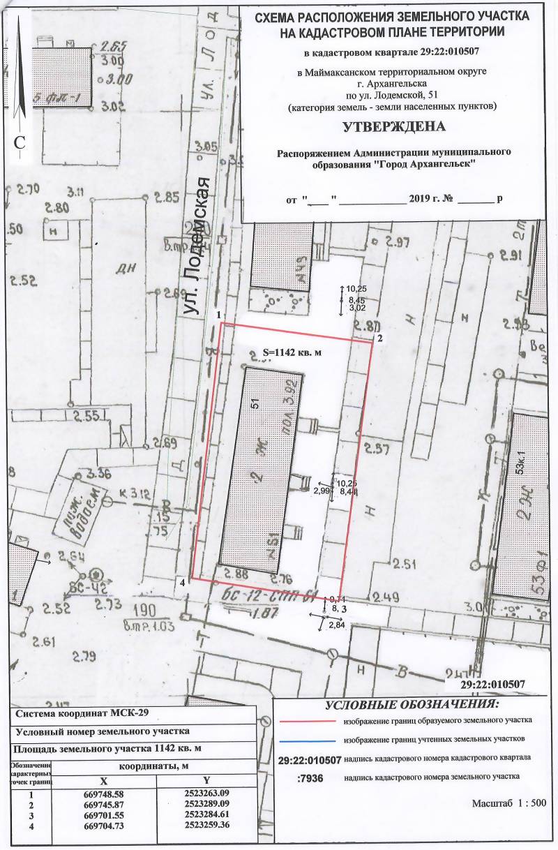 2. Адрес месторасположения земельного участка: г. Архангельск, ул. Лодемская, д. 51. Данный земельный участок расположен в кадастровом квартале 29:22:010507. Планируемая к утверждению схема расположения земельного участка:
