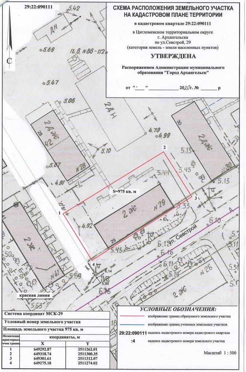 2. Адрес месторасположения земельного участка: г. Архангельск, ул. Севстрой, д. 29. Данный земельный участок расположен в кадастровом квартале 29:22:090111. Планируемая к утверждению схема расположения земельного участка: