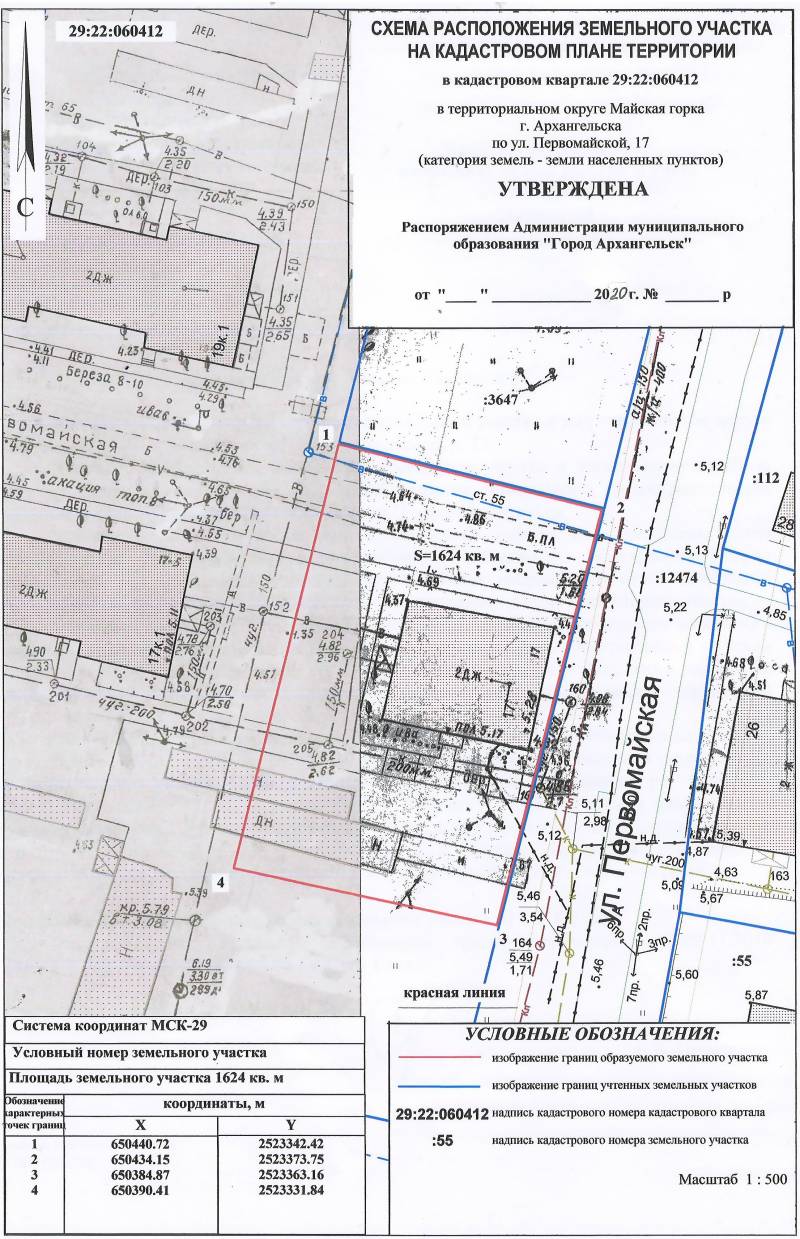 2. Адрес месторасположения земельного участка: г. Архангельск, ул. Первомайская, д. 17. Данный земельный участок расположен в кадастровом квартале 29:22:060412. Планируемая к утверждению схема расположения земельного участка: