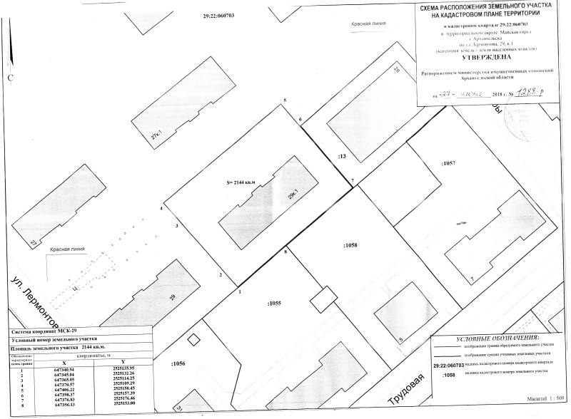 2. Адрес месторасположения земельного участка: г. Архангельск, ул. Лермонтова, д. 29, корп. 1. Данный земельный участок расположен в кадастровом квартале 29:22:060703. Утвержденная схема расположения земельного участка: