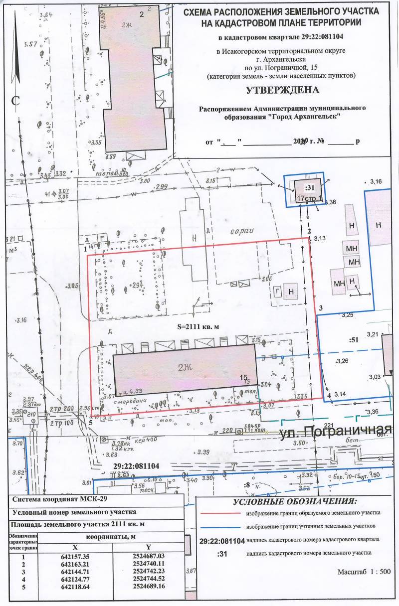 2. Адрес месторасположения земельного участка: г. Архангельск, ул. Пограничная, д. 15. Данный земельный участок расположен в кадастровом квартале 29:22:081104. Планируемая к утверждению схема расположения земельного участка:
