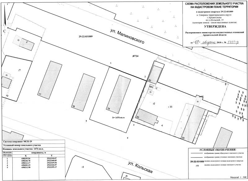 2. Адрес месторасположения земельного участка: г. Архангельск, ул. Кольская, д. 19. Данный земельный участок расположен в кадастровом квартале 29:22:031009. Утвержденная схема расположения земельного участка:
