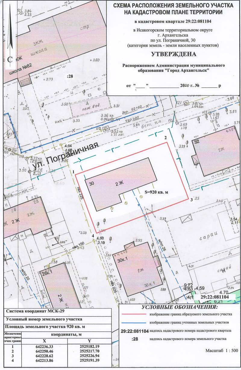 2. Адрес месторасположения земельного участка: г. Архангельск, ул. Пограничная, д. 30. Данный земельный участок расположен в кадастровом квартале 29:22:081104. Планируемая к утверждению схема расположения земельного участка:
