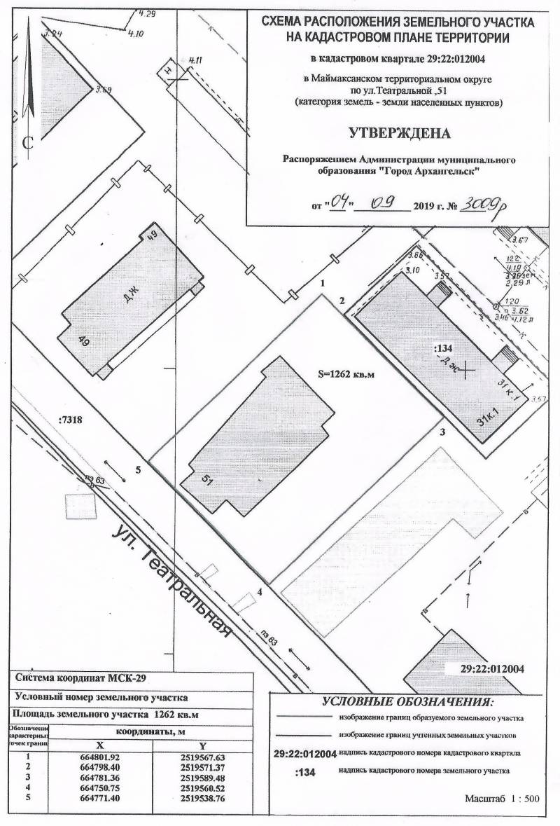 2. Адрес месторасположения земельного участка: г. Архангельск, ул. Театральная, д. 51. Данный земельный участок расположен в кадастровом квартале 29:22:012004. Утвержденная схема расположения земельного участка: