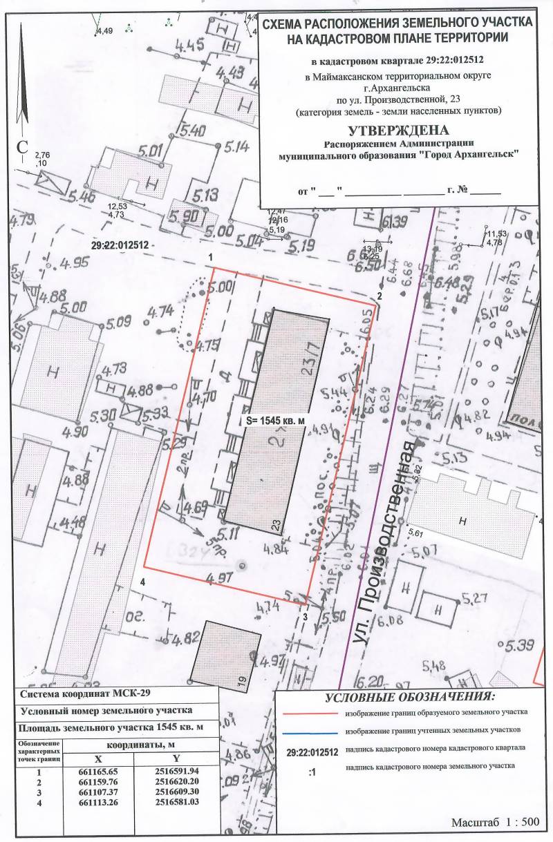 2. Адрес месторасположения земельного участка: г. Архангельск, ул. Производственная, д. 23. Данный земельный участок расположен в кадастровом квартале 29:22:012512. Планируемая к утверждению схема расположения земельного участка: