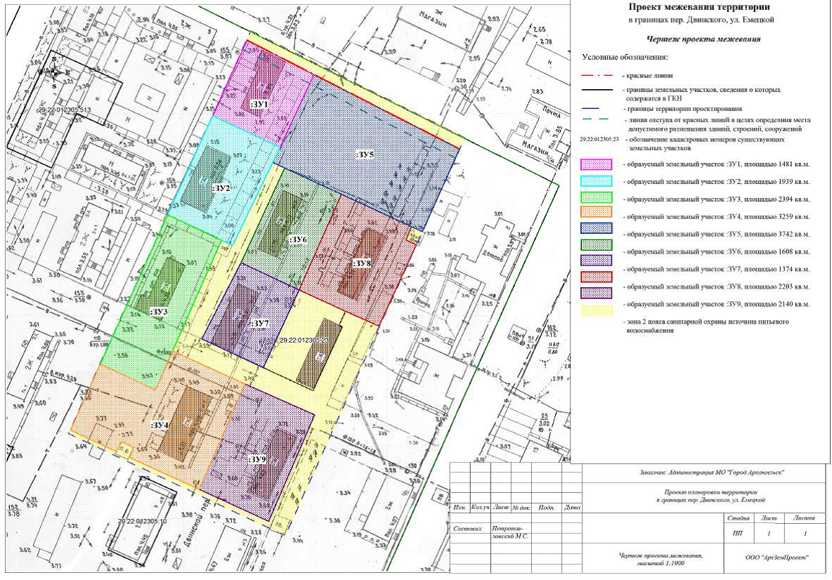 2. Адрес месторасположения земельного участка: г. Архангельск, ул. Емецкая, д. 7. Границы земельного участка 29:22:012305:ЗУ1 определены проектом межевания территории муниципального образования "Город Архангельск" в границах пер. Двинского и ул. Емецкой, утвержденным распоряжением Главы муниципального образования "Город Архангельск" от 07.03.2018 № 769р: