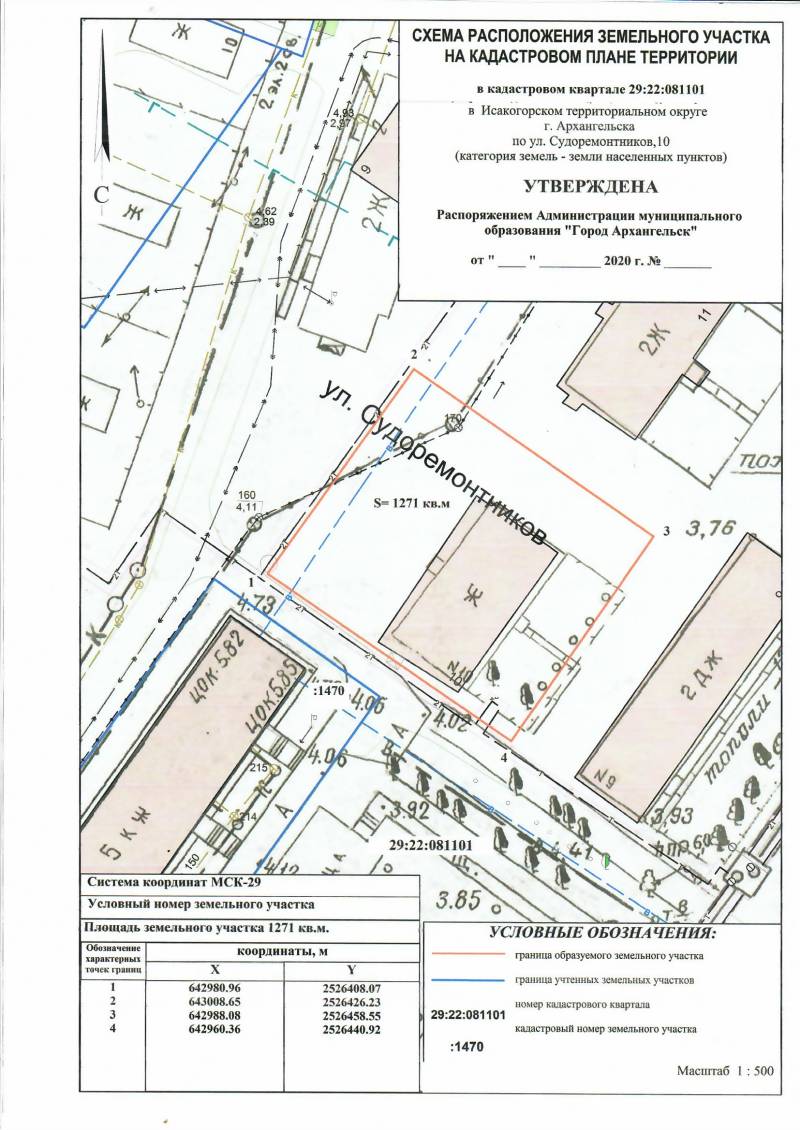 2. Адрес месторасположения земельного участка: г. Архангельск, ул. Судоремонтников, д. 10. Данный земельный участок расположен в кадастровом квартале 29:22:081101. Планируемая к утверждению схема расположения земельного участка: