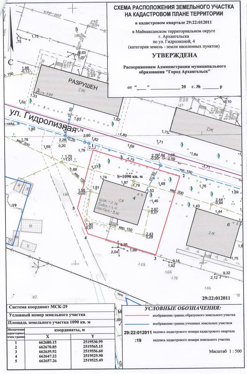 2. Адрес месторасположения земельного участка: г. Архангельск, ул. Гидролизная, д. 4. Данный земельный участок расположен в кадастровом квартале 29:22:012011. Планируемая к утверждению схема расположения земельного участка: