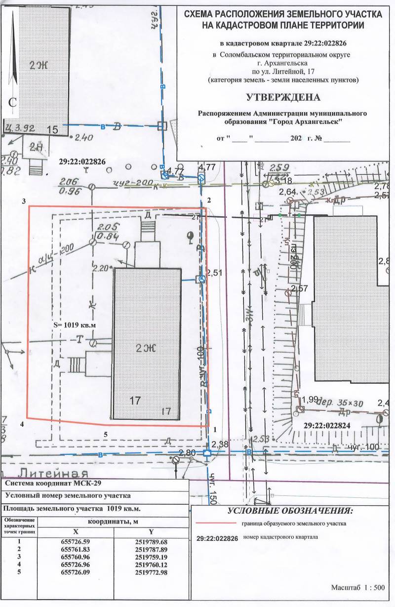 2. Адрес месторасположения земельного участка: г. Архангельск, ул. Литейная, д. 17. Данный земельный участок расположен в кадастровом квартале 29:22:022826. Планируемая к утверждению схема расположения земельного участка: