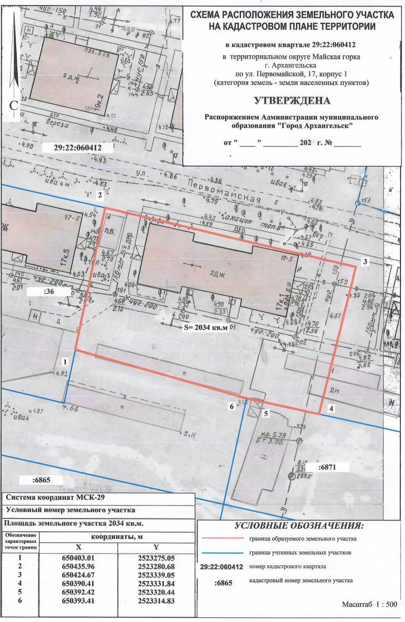 2. Адрес месторасположения земельного участка: г. Архангельск, ул. Первомайская, д. 17, корп. 1. Данный земельный участок расположен в кадастровом квартале 29:22:060412. Планируемая к утверждению схема расположения земельного участка: