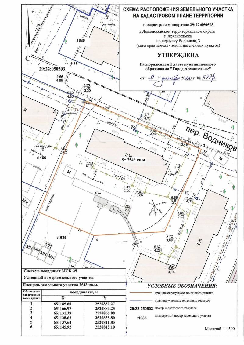 2. Адрес месторасположения земельного участка: г. Архангельск, пер. Водников, д. 3. Данный земельный участок расположен в кадастровом квартале 29:22:050503. Утвержденная схема расположения земельного участка: