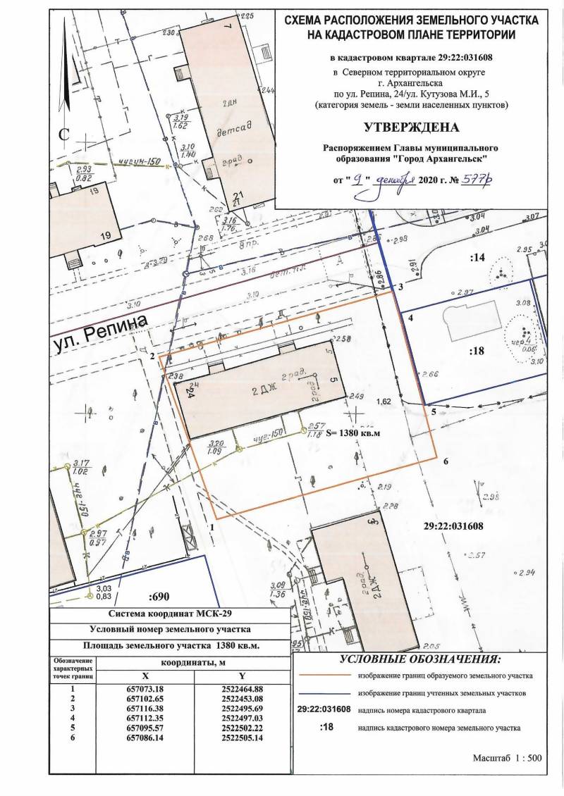 ул. Репина, д. 24/ул. Кутузова М.И., д. 5. Данный земельный участок расположен в кадастровом квартале 29:22:031608. Утвержденная схема расположения земельного участка: