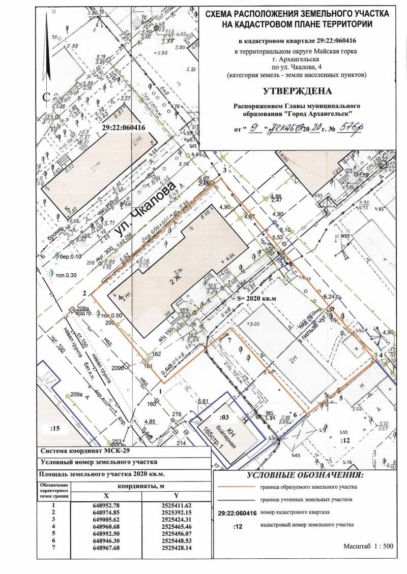 2. Адрес месторасположения земельного участка: г. Архангельск, ул. Чкалова, д. 4. Данный земельный участок расположен в кадастровом квартале 29:22:060416. Утвержденная схема расположения земельного участка: