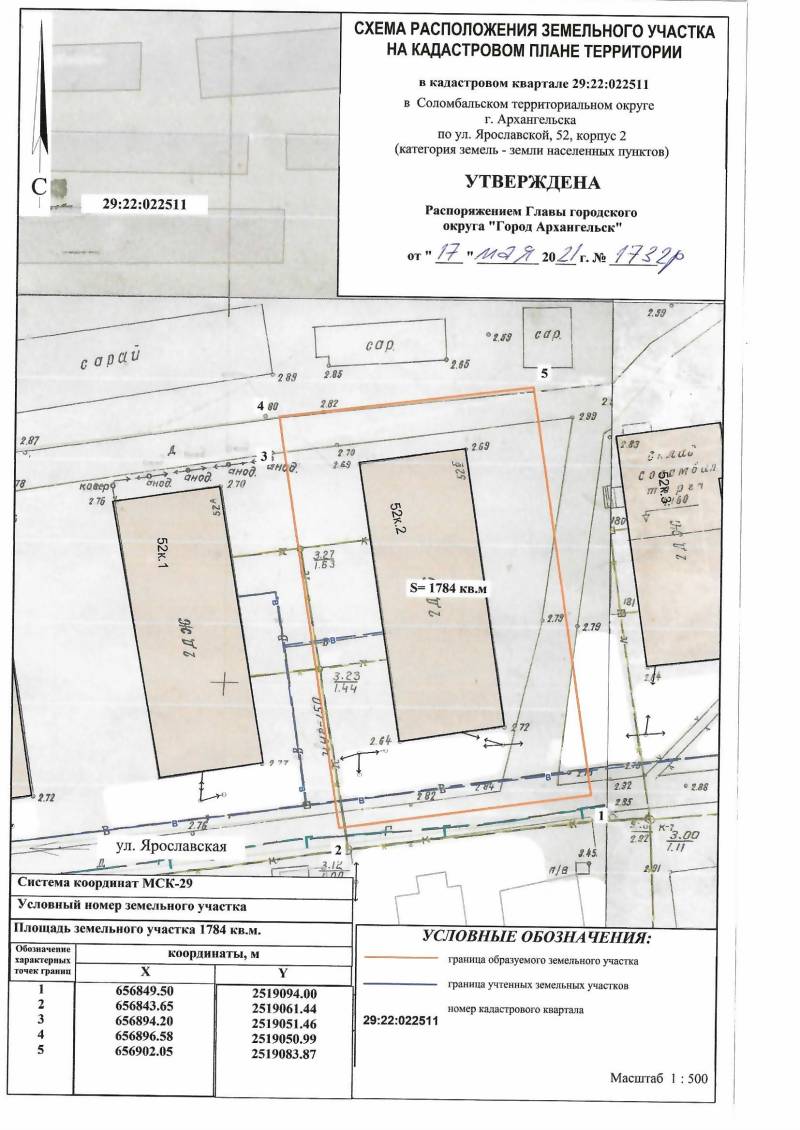 2. Адрес месторасположения земельного участка: г. Архангельск, ул. Ярославская, д. 52, корп. 2. Данный земельный участок расположен в кадастровом квартале 29:22:022511. Утвержденная схема расположения земельного участка: