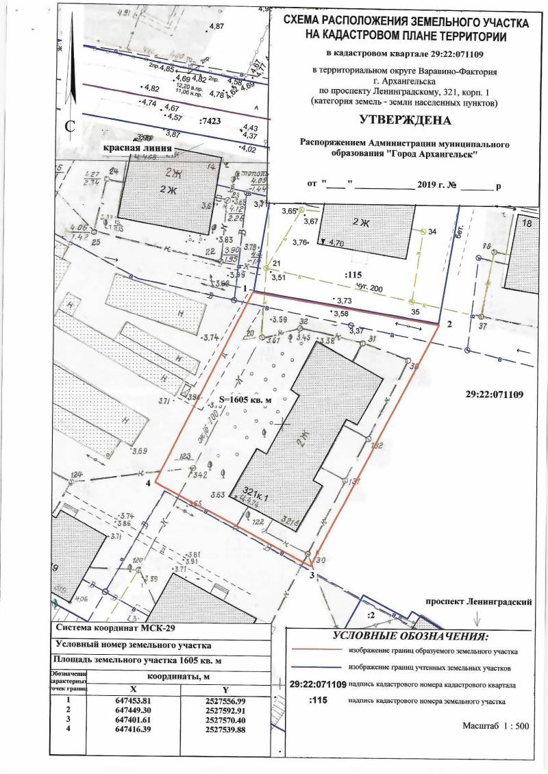 просп. Ленинградский, д. 321 корп. 1. Данный земельный участок расположен в кадастровом квартале 29:22:071109. Планируемая к утверждению схема расположения земельного участка: