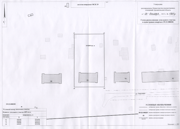 2. Адрес месторасположения земельного участка: г. Архангельск, ул.Пирсовая, д.66. Данный земельный участок расположен в кадастровом квартале 29:22:080201. Утвержденная схема расположения земельного участка: