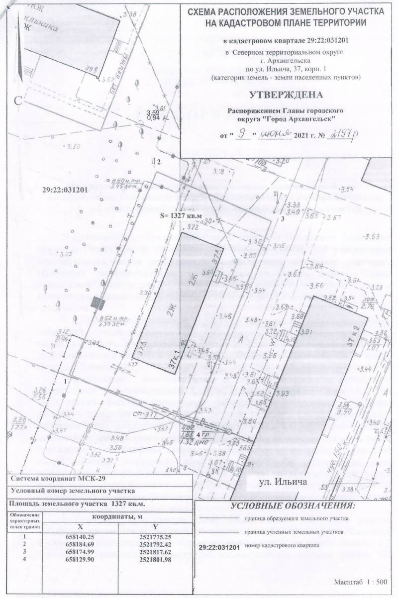 д. 37, корп. 1. Данный земельный участок расположен в кадастровом квартале 29:22:031201. Утвержденная схема расположения земельного участка: