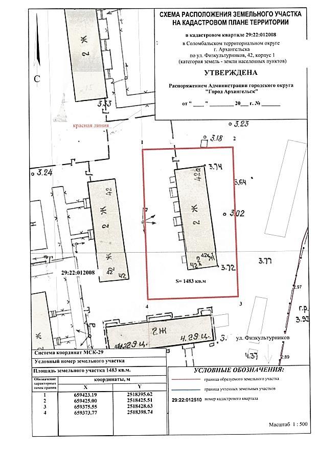 2. Адрес месторасположения земельного участка: г. Архангельск, ул. Физкультурников, д. 42, корп. 1 Данный земельный участок расположен в кадастровом квартале 29:22:012008. Планируемая к утверждению схема расположения земельного участка: