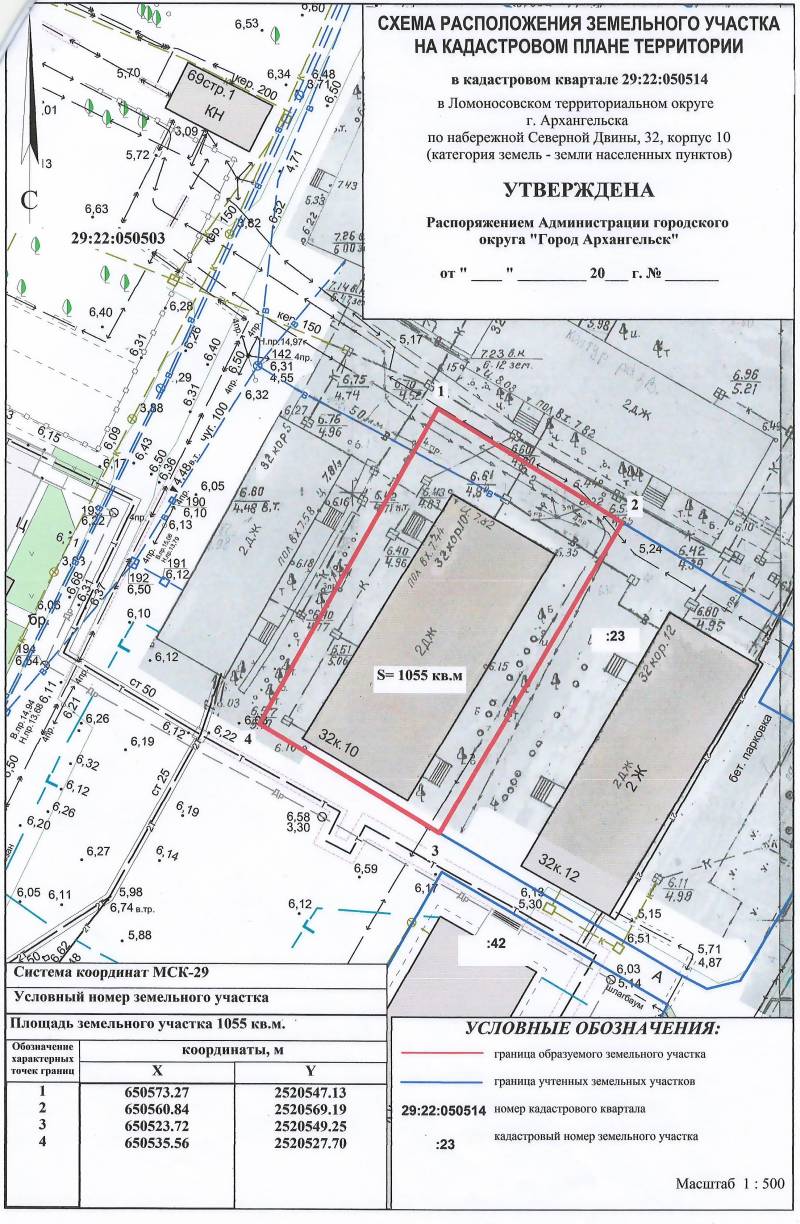д. 32, корп. 10. Данный земельный участок расположен в кадастровом квартале 29:22:050514. Планируемая к утверждению схема расположения земельного участка: