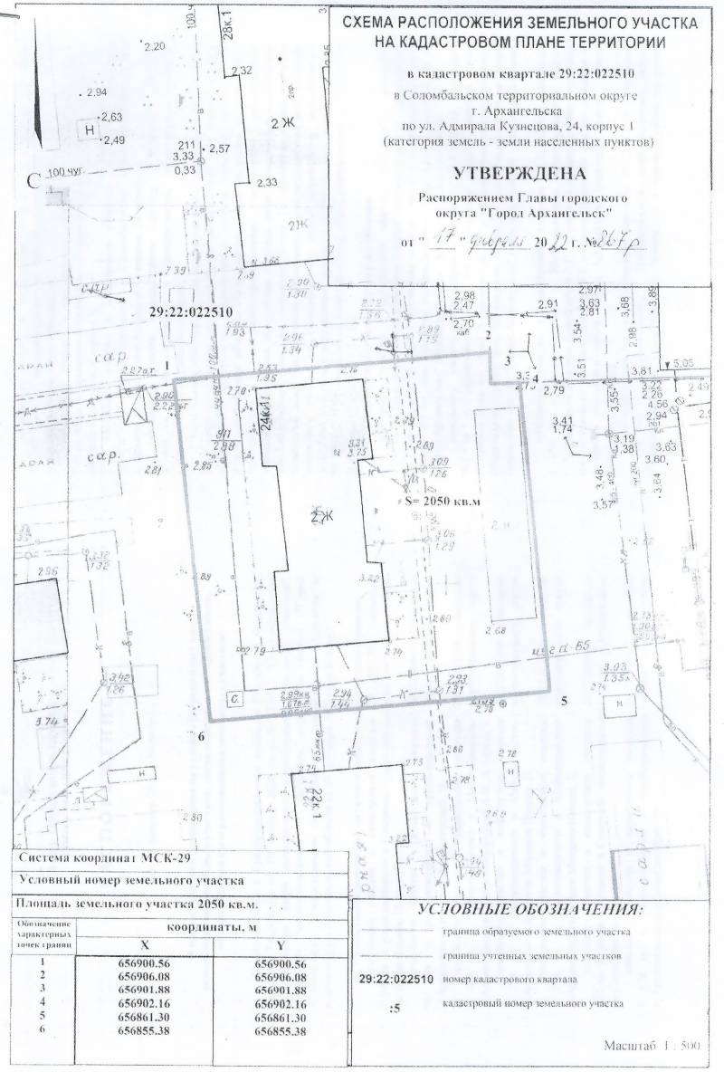 д. 24, корп. 1. Данный земельный участок расположен в кадастровом квартале 29:22:022510. Утвержденная схема расположения земельного участка: