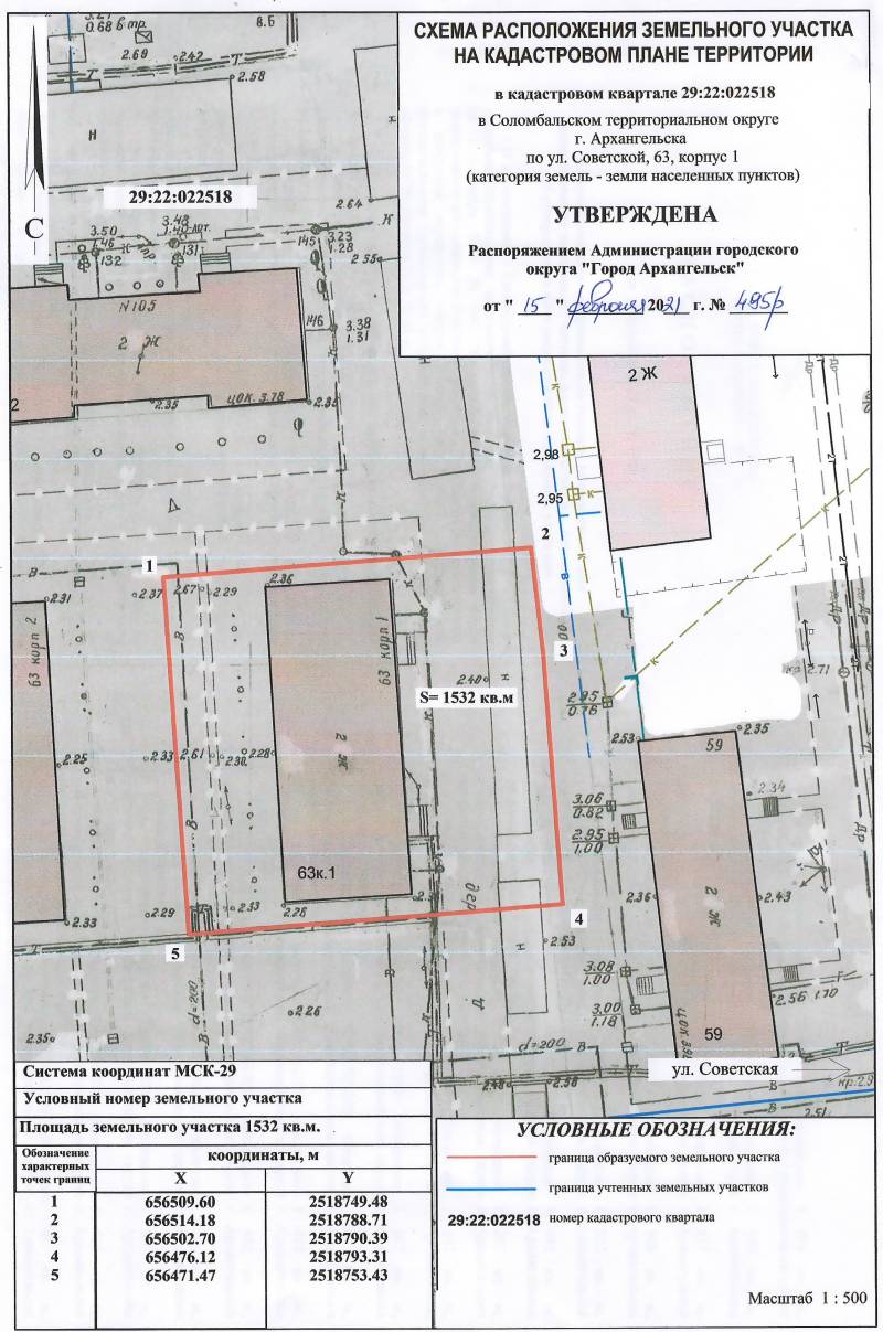 2. Адрес месторасположения земельного участка: г. Архангельск, ул. Советская, д. 63, корп. 1. Данный земельный участок расположен в кадастровом квартале 29:22:022518. Утвержденная схема расположения земельного участка: