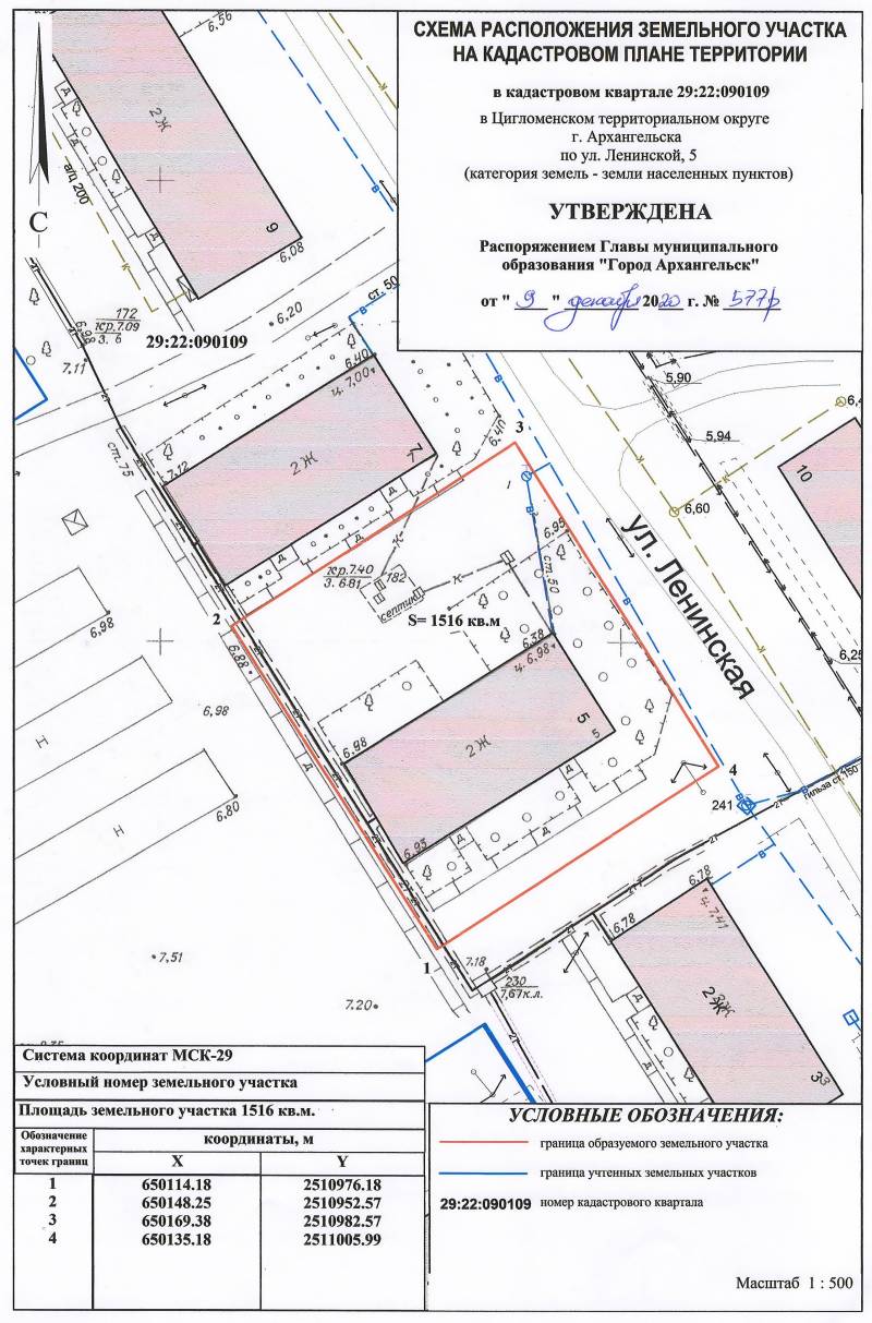 д. 5. Данный земельный участок расположен в кадастровом квартале 29:22:090109. Утвержденная схема расположения земельного участка: