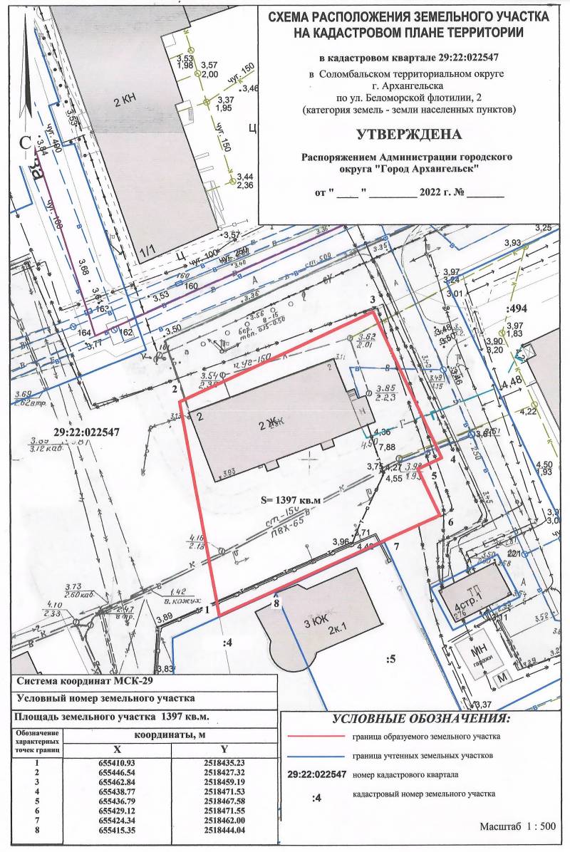 2. Адрес месторасположения земельного участка: г. Архангельск, ул. Беломорской флотилии д. 2. Данный земельный участок расположен в кадастровом квартале 29:22:022547. Планируемая к утверждению схема расположения земельного участка: