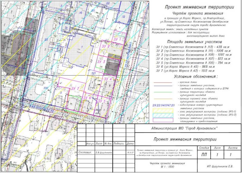 2. Адрес месторасположения земельного участка: г. Архангельск, просп. Советских космонавтов, д. 105. Границы земельного участка 29:22:040747:ЗУ5 определены проектом межевания территории муниципального образования "Город Архангельск" в границах ул. Карла Маркса, просп. Новгородского, ул. Попова и просп. Советских космонавтов, утвержденным распоряжением Главы муниципального образования "Город Архангельск" от 07.02.2018 № 451р: