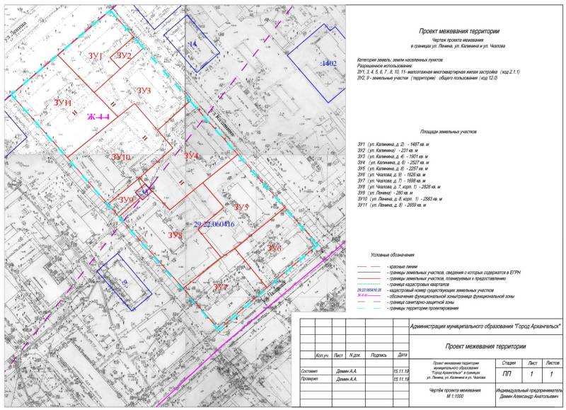 2. Адрес месторасположения земельного участка: г. Архангельск, ул. Ленина, д. 8. Границы земельного участка 29:22:060416:ЗУ11 определены проектом межевания городского округа "Город Архангельск" в границах ул. Ленина, ул. Калинина и ул. Чкалова площадью 2,0188 га, утвержденным распоряжением Главы муниципального образования "Город Архангельск" от 19.08.2020 № 2830р: