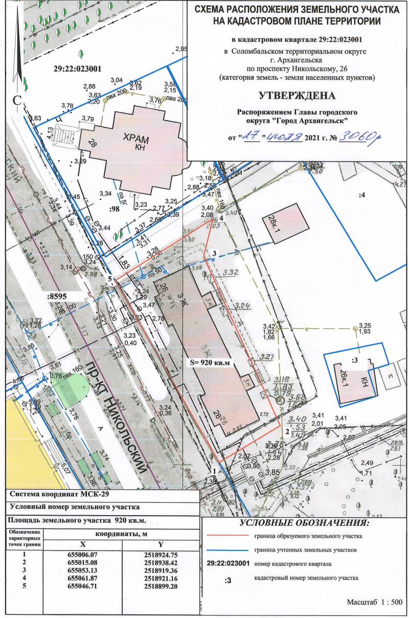2. Адрес месторасположения земельного участка: г. Архангельск, просп. Никольский, д. 26. Данный земельный участок расположен в кадастровом квартале 29:22:023001. Утвержденная схема расположения земельного участка: