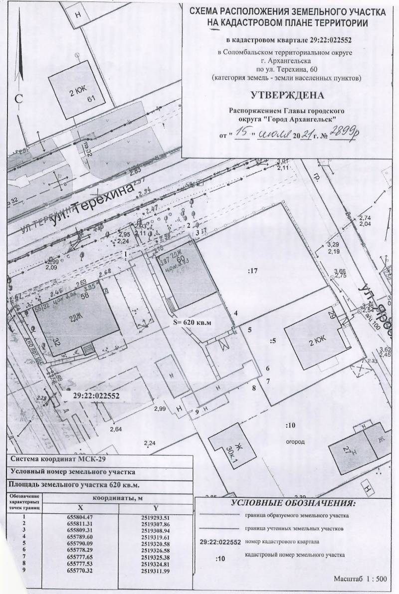 2. Адрес месторасположения земельного участка: г. Архангельск, ул. Терехина, д. 60. Данный земельный участок расположен в кадастровом квартале 29:22:022552. Утвержденная схема расположения земельного участка: