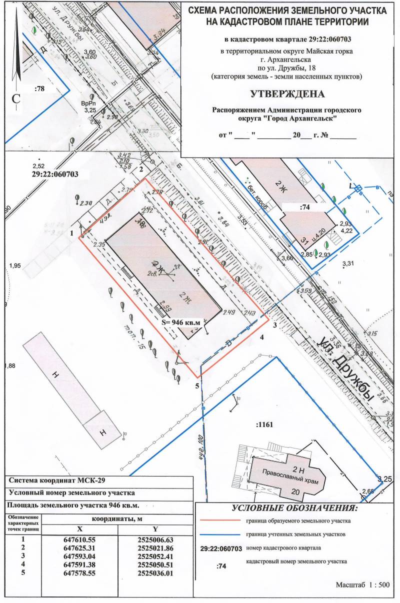 2. Адрес месторасположения земельного участка: г. Архангельск, ул. Дружбы, д. 18. Данный земельный участок расположен в кадастровом квартале 29:22:060703. Планируемая к утверждению схема расположения земельного участка: