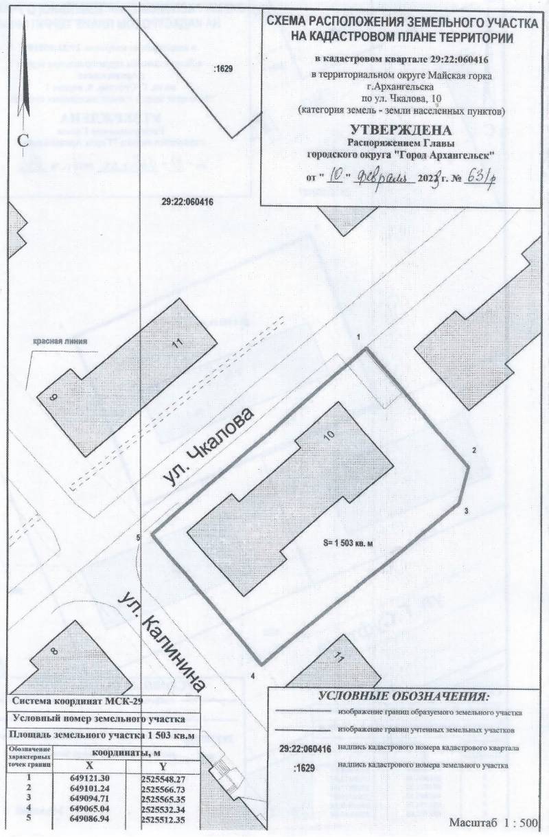 2. Адрес месторасположения земельного участка: г. Архангельск, ул. Чкалова, д. 10. Данный земельный участок расположен в кадастровом квартале 29:22:060416. Утвержденная схема расположения земельного участка: