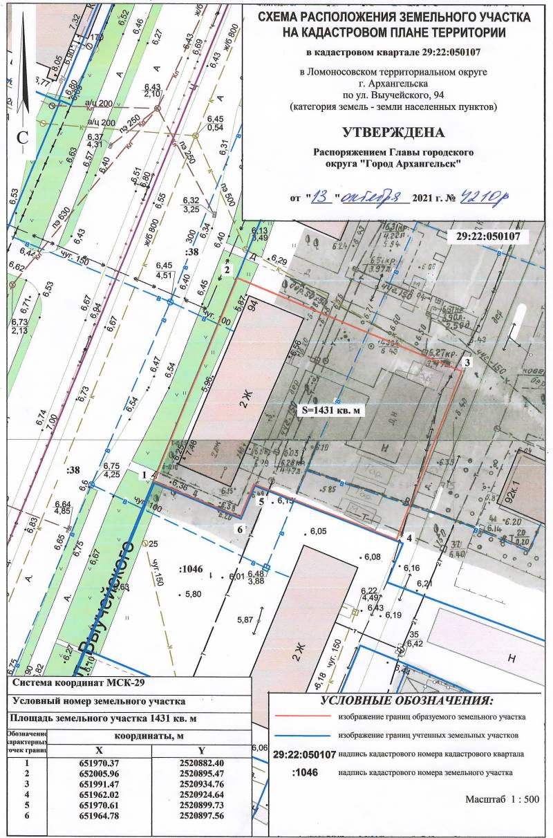 2. Адрес месторасположения земельного участка: г. Архангельск, ул. Выучейского, д. 94. Данный земельный участок расположен в кадастровом квартале 29:22:050107. Утвержденная схема расположения земельного участка: