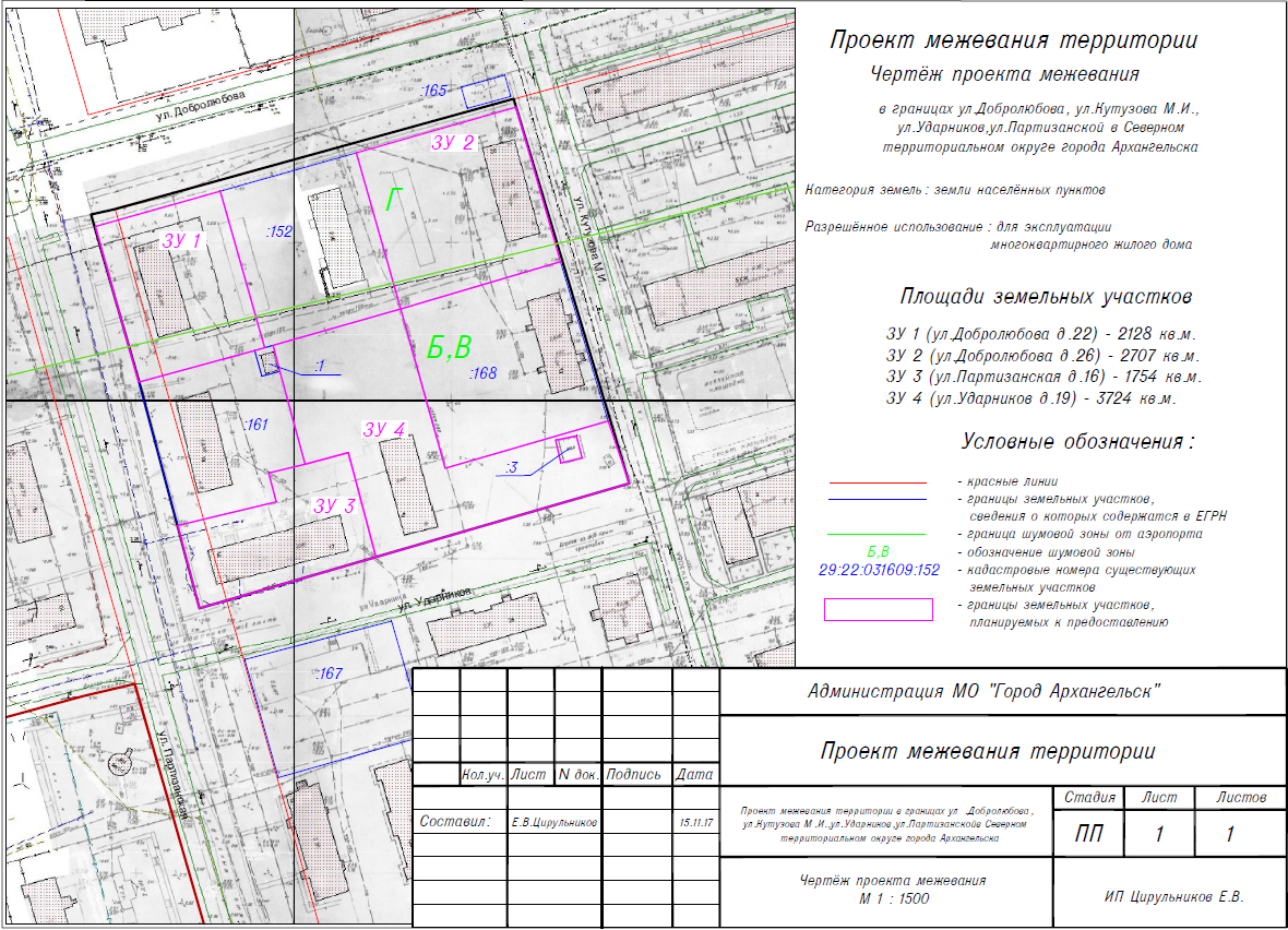 2. Адрес месторасположения земельного участка: г. Архангельск, ул. Добролюбова, д. 22. Границы земельного участка 29:22:031609:ЗУ1 определены проектом межевания территории муниципального образования "Город Архангельск" в границах ул. Добролюбова, ул. Кутузова М.И., ул. Ударников и ул. Партизанской, утвержденным распоряжением Главы муниципального образования "Город Архангельск" от 06.02.2018 № 433р: