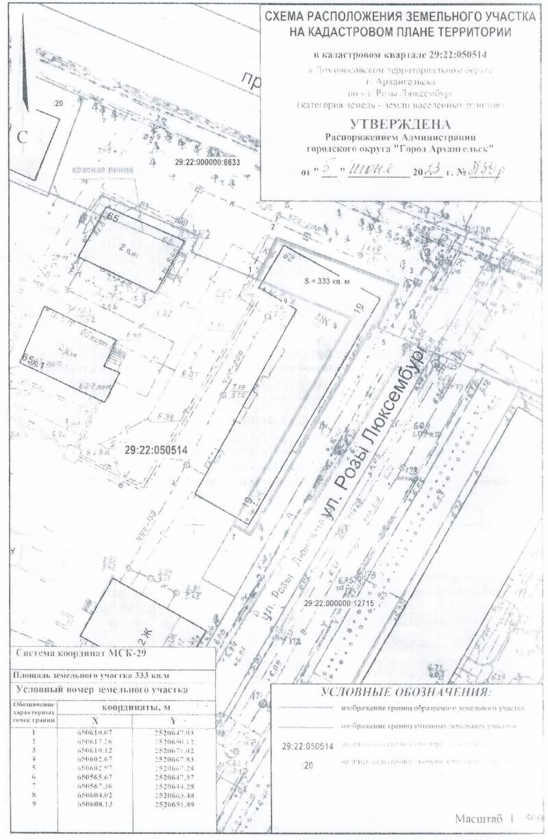 д. 19. Кадастровый номер одного земельного участка 29:22:050514:1711. Второй земельный участок расположен в кадастровом квартале 29:22:050514. Утвержденная схема расположения второго земельного участка: