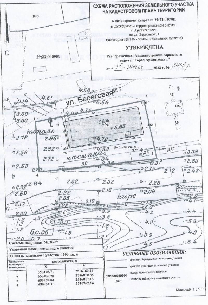 2. Адрес месторасположения земельного участка: г. Архангельск, ул. Береговая, д. 1. Данный земельный участок расположен в кадастровом квартале 29:22:040901. Утвержденная схема расположения земельного участка: