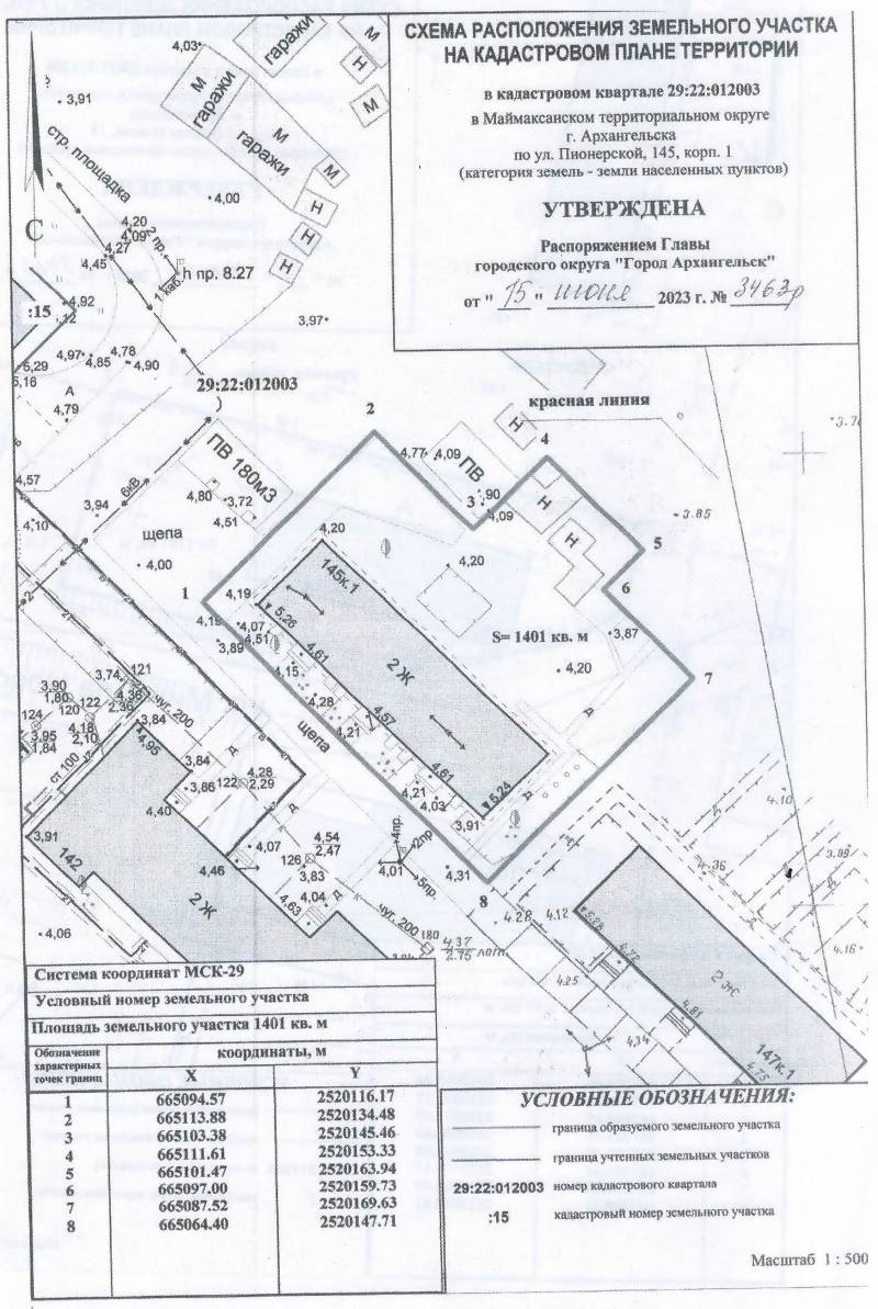 2. Адрес месторасположения земельного участка: г. Архангельск, ул. Пионерская, д. 145, корп. 1. Данный земельный участок расположен в кадастровом квартале 29:22:012003. Утвержденная схема расположения земельного участка: