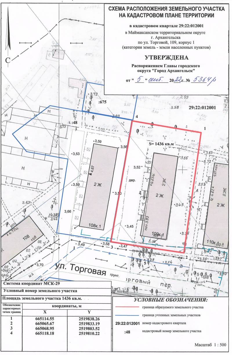 2. Адрес месторасположения земельного участка: г. Архангельск, ул. Торговая, д. 109, корп. 1. Данный земельный участок расположен в кадастровом квартале 29:22:012001. Утвержденная схема расположения земельного участка: