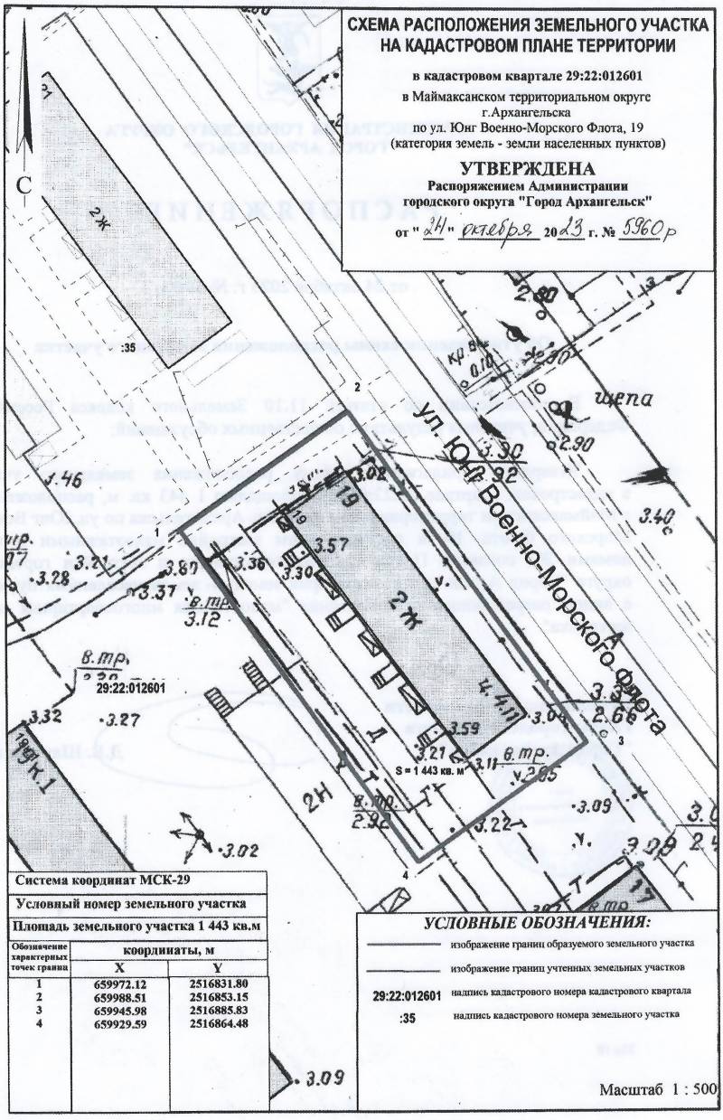 2. Адрес месторасположения земельного участка: г. Архангельск, ул. Юнг Военно-Морского Флота, д. 19. Данный земельный участок расположен в кадастровом квартале 29:22:012601. Утвержденная схема расположения земельного участка: