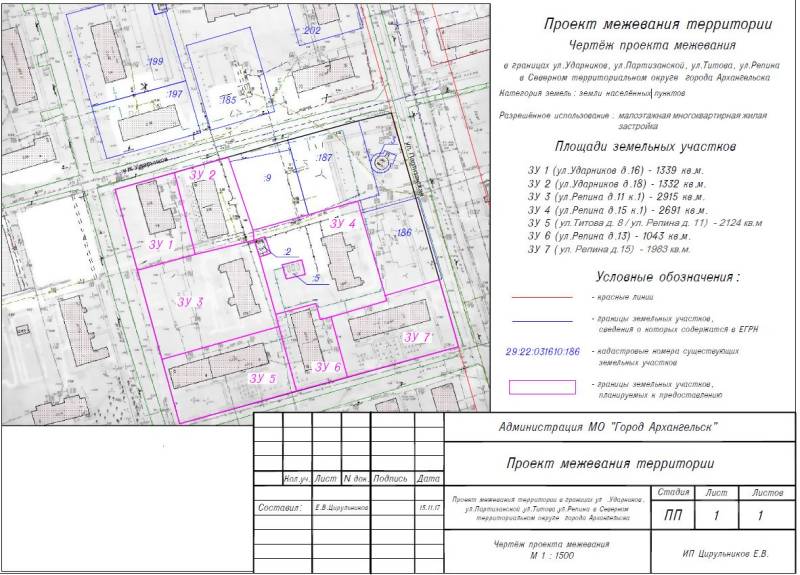 2. Адрес месторасположения земельного участка: г. Архангельск, ул. Репина, д. 15. Границы земельного участка 29:22:031610:ЗУ7 определены проектом межевания территории в границах ул. Ударников, ул. Партизанской, ул. Репина и ул. Титова, утвержденным распоряжением Главы городского округа "Город Архангельск" от 29.09.2023 № 5529р:
