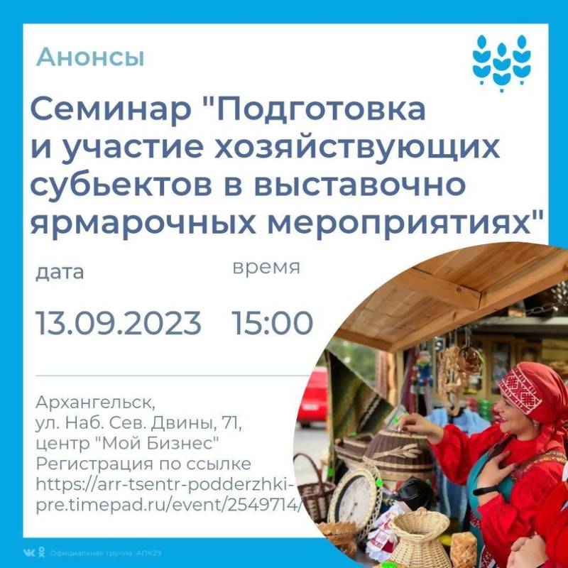 В сентябре состоится главное торговое мероприятие Поморья - Маргаритинская ярмарка. Чтобы участие в ней стало эффективным, 13 сентября на базе Агентства регионального развития пройдет обучающий семинар "Подготовка и участие хозяйствующих субъектов в выставочно-ярмарочных мероприятиях" в очном и онлайн форматах.