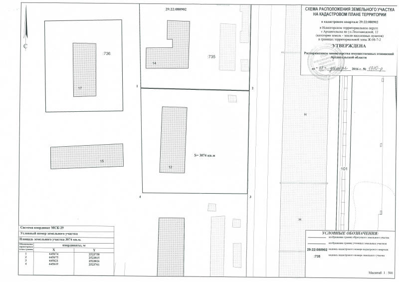 1.   Изъять для муниципальных нужд земельный участок площадью 3074 кв.м в кадастровом квартале 29:22:080902, расположенный в Исакогорском территориальном округе г.Архангельска по ул.Лесозаводской, д.12, согласно прилагаемой схеме расположения земельного участка, утвержденной распоряжением Министерства имущественных отношений Архангельской области от 13 декабря 2016 года № 1910-р.
