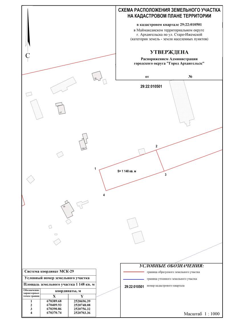 Департамент градостроительства Администрации городского округа "Город Архангельск" извещает о возможности предоставления земельного участка, расположенного в Маймаксанском территориальном округе г. Архангельска по ул. Старо-Ижемской площадью 1 148 кв. м, для индивидуального жилищного строительства согласно представленной схеме расположения земельного участка.