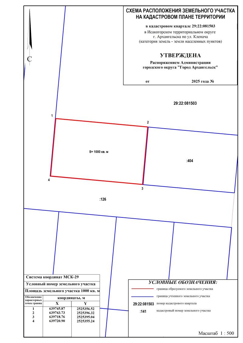 Департамент градостроительства Администрации городского округа "Город Архангельск" извещает о возможности предоставления земельного участка, расположенного в Исакогорском территориальном округе г. Архангельска по ул. Клепача, площадью 1000 кв. м, для индивидуального жилищного строительства согласно представленной схеме расположения земельного участка.