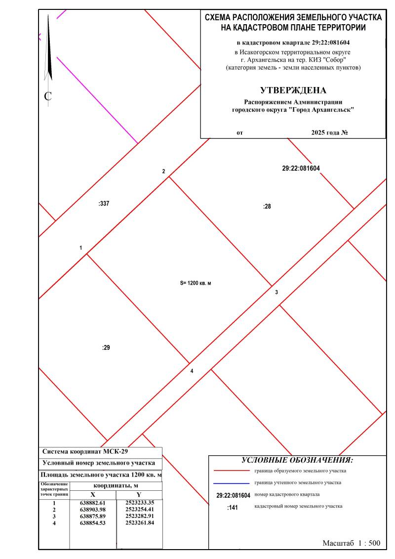 Департамент градостроительства Администрации городского округа "Город Архангельск" извещает о возможности предоставления земельного участка, расположенного в Исакогорском территориальном округе г. Архангельска на тер. КИЗ "Собор" площадью 1 200 кв. м, для индивидуального жилищного строительства согласно представленной схеме расположения земельного участка.